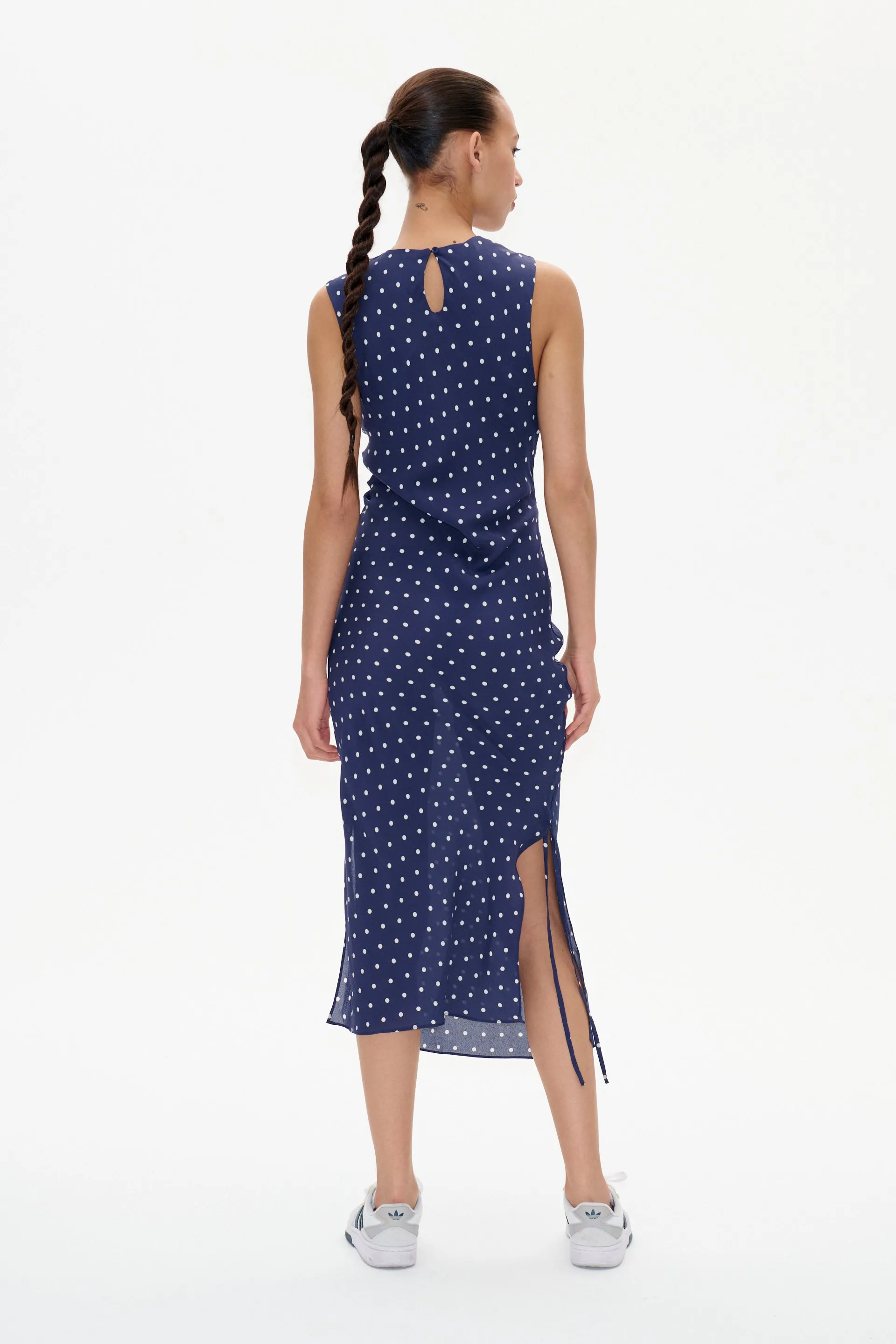 This midi-length, sleeveless dress features a button closure with keyhole opening in the back and ruching with an asymmetrical drawstring across the front.